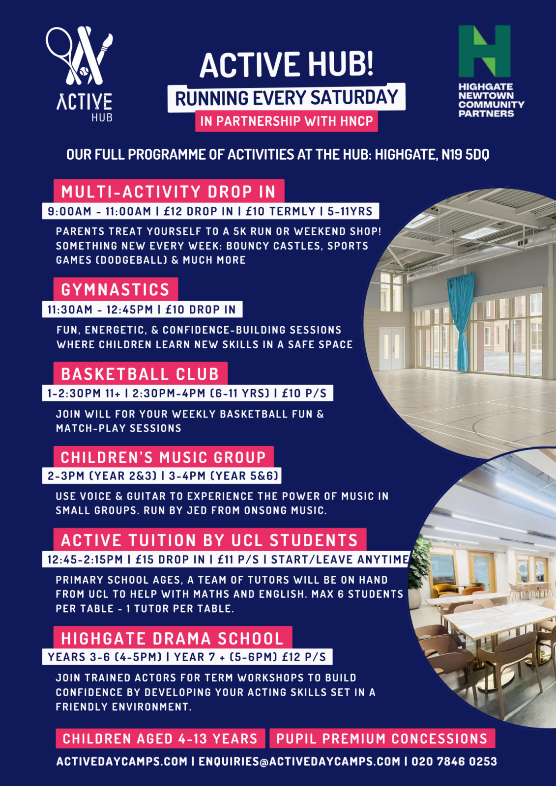 Please see poster below, for an exciting new partnership between Active Day Camps and Highgate NEwtown Centre, running their Active Hub every Saturday with a full programme of activities for children aged 4-13.