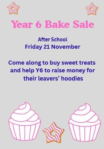 Finally, Y6 are having a bake sale at pick up next Friday 21st November to raise money for their leavers’ hoodies! Please pop by to buy their treats and help them on their endeavour!